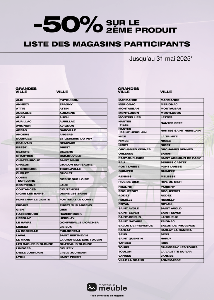 Profitez de nos offres exclusives de mai ! Bénéficiez -50% sur le 2ème produit dans votre magasin Monsieur Meuble.