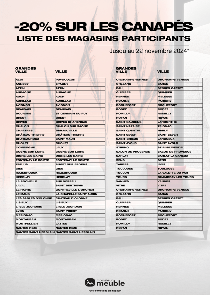 Retrouvez ci-dessous la liste des magasins participants à l'opération "-20% sur les canapés".