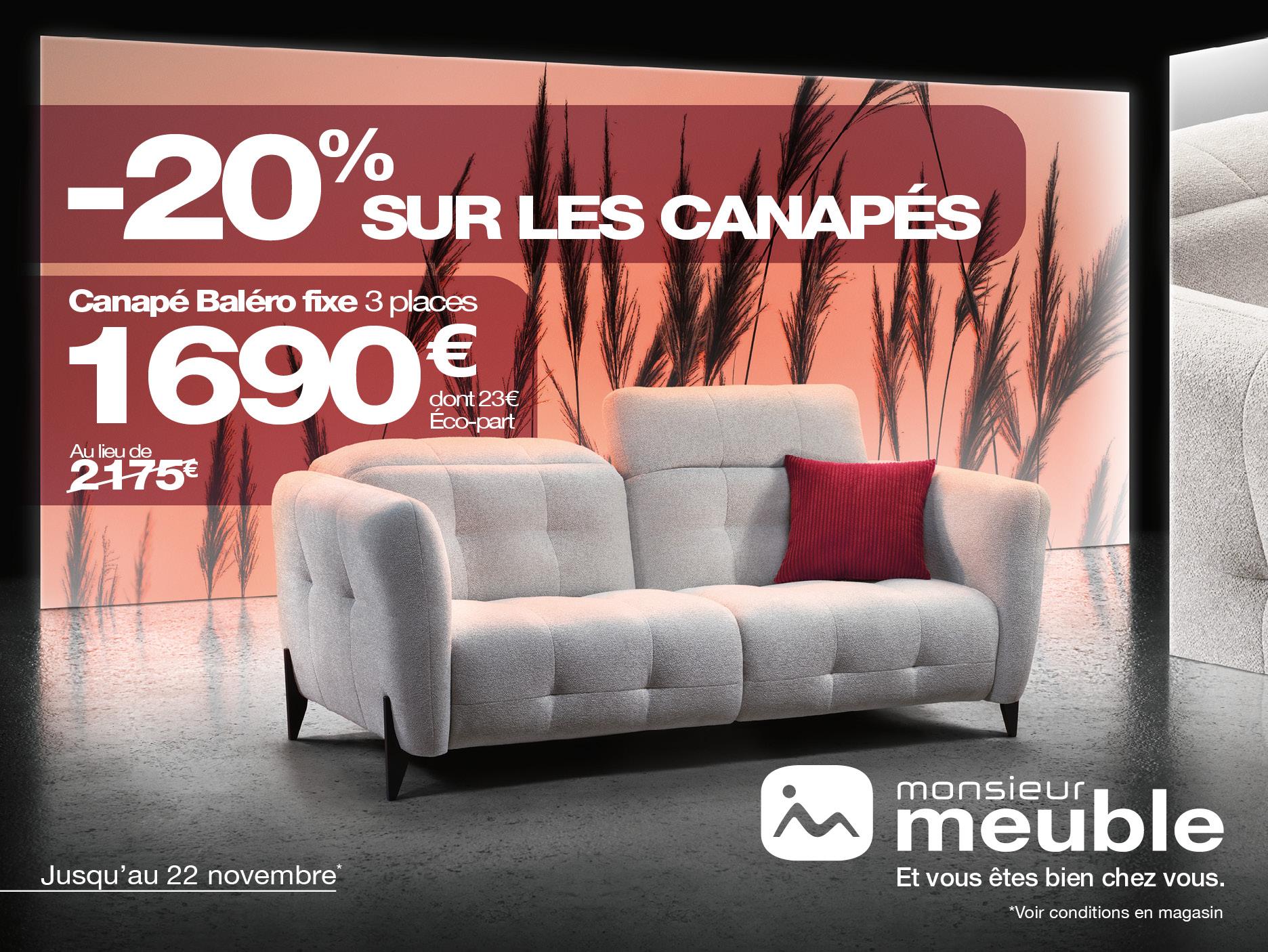 Profitez de nos offres exclusives de novembre ! Bénéficiez -20% sur les canapés dans votre magasin Monsieur Meuble.