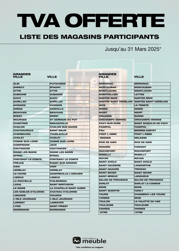 Retrouvez ci-dessous la liste des magasins participants à l'opération "TVA OFFERTE".