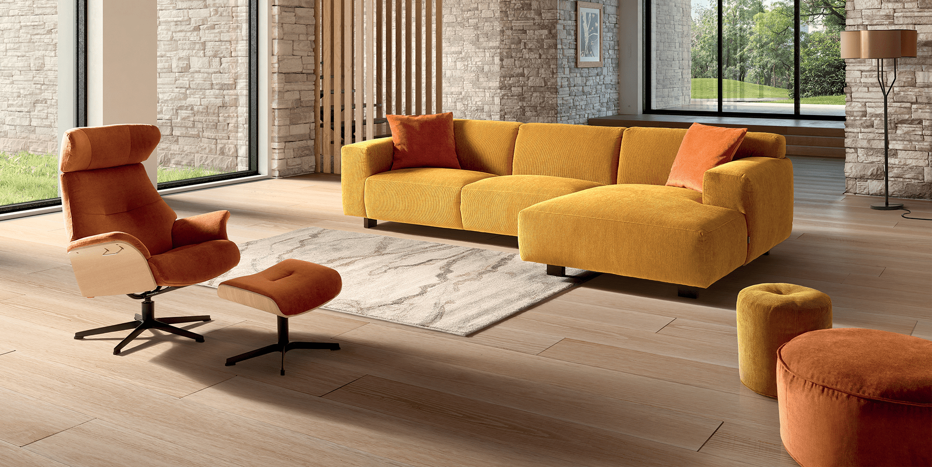 Garnissage : mousse polyuréthane moulée avec fibre de ouate 200 gr. Densité : assise, dossier et têtière : 55/60 kg/m³, accoudoirs 35 kg/m³.